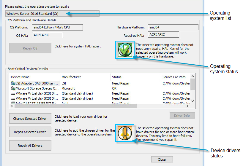The Repair wizard shows information about the operating system, hardware, and boot-critical devices. Status icons appear for the operating system and device drivers. For more information, see Items in the Repair wizard.