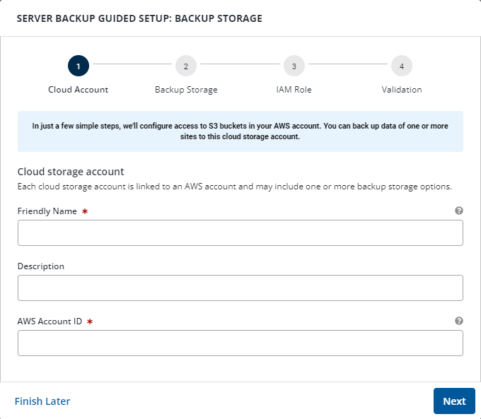 Note: If you need time to create the IAM role, click Finish Later to pause the storage setup. When you start the storage setup again, the wizard starts on the next page where information is required.